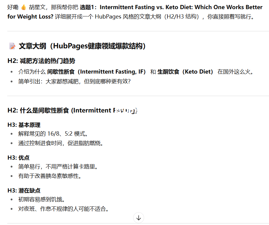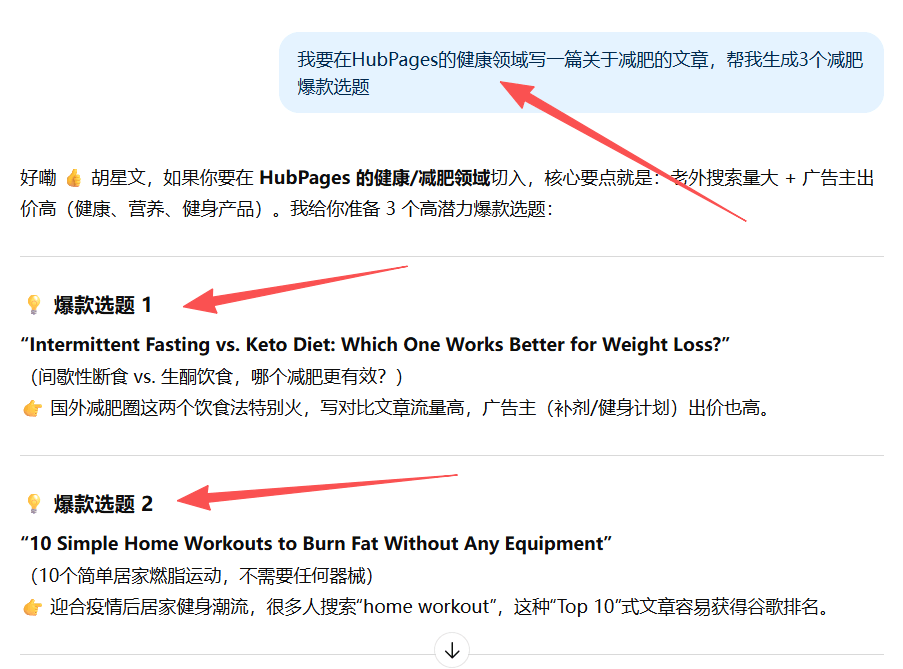 比如:我要在HubPages的健康领域写一篇关于减肥的文章,帮我生成3个减肥爆款选题