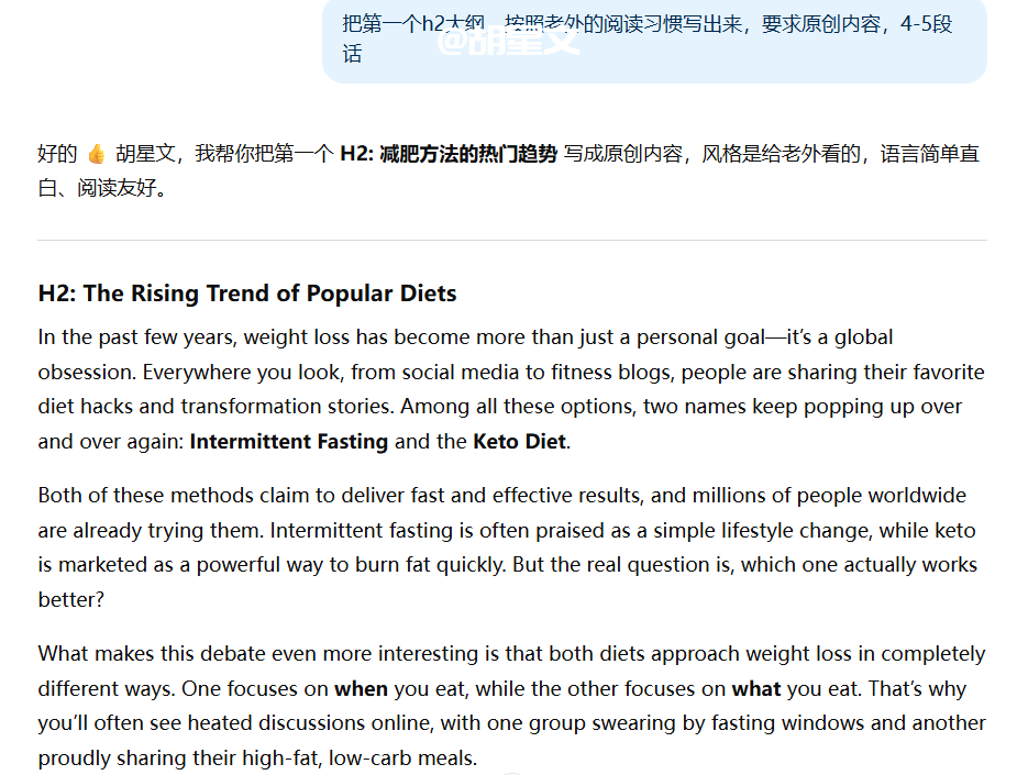 这样让AI帮你写文章的时候就很方便,写出来的内容,更符合老外的阅读习惯。
