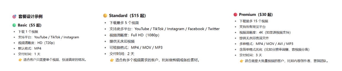 而对于我们来说,这个服务几乎没有成本,只需要掌握一些靠谱的下载工具和方法,就能快速帮客户搞定,还能提供高清、无水印、多格式选择,让服务看起来更专业。
