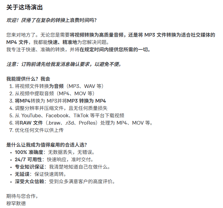账号注册了后,需要创建一个服务(Gig),把服务名称写清楚,比如“我可以帮你下载任何平台的视频”,在描述里说明能处理哪些网站(YouTube、TikTok、Instagram 等),还要提到能提供无水印、高清、多格式下载。