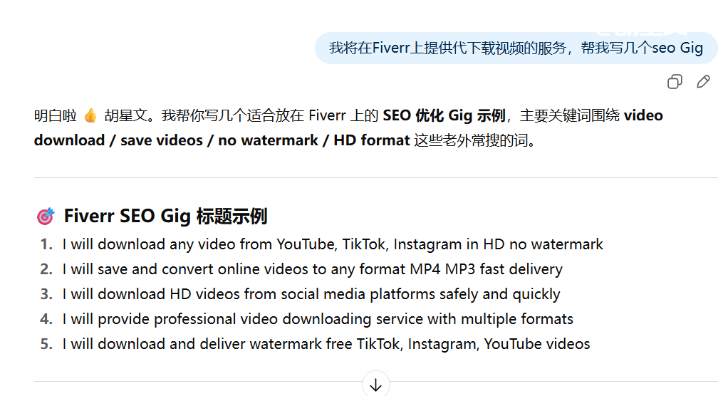 “我将在Fiverr上提供代下载视频的服务,帮我写几个seo Gig”