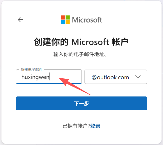 还有另外一种注册Outlook邮箱的方法,那就是直接使用Microsoft账户来创建,如果你电脑使用的是Windows系统,那么你肯定有Microsoft账户,也就是你电脑的登陆账户。