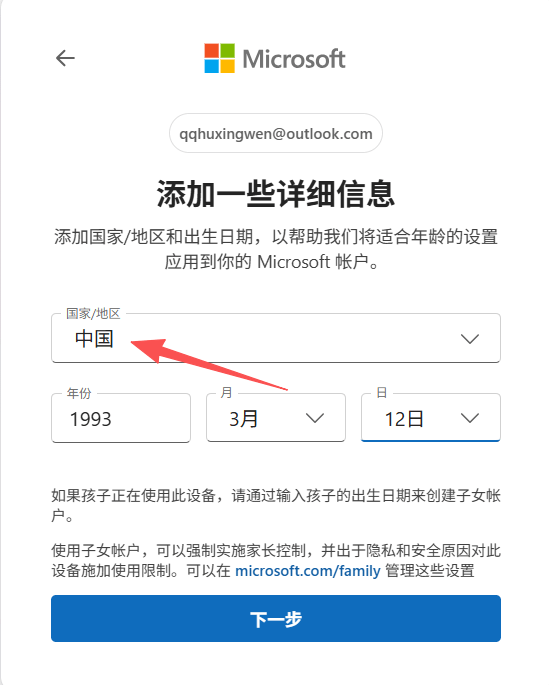 添加详细信息:直接选择中国,填写自己的出生日期即可。