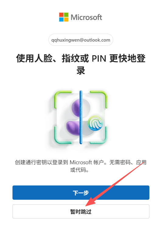 这里推荐你创建一个秘钥,以便更好的登陆Microsoft账户,这个可以暂时不设置,算是一个双重安全保障,暂时跳过即可。