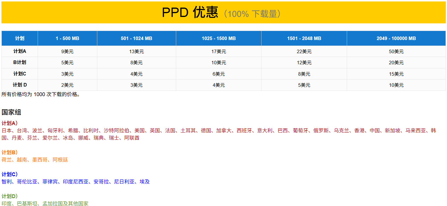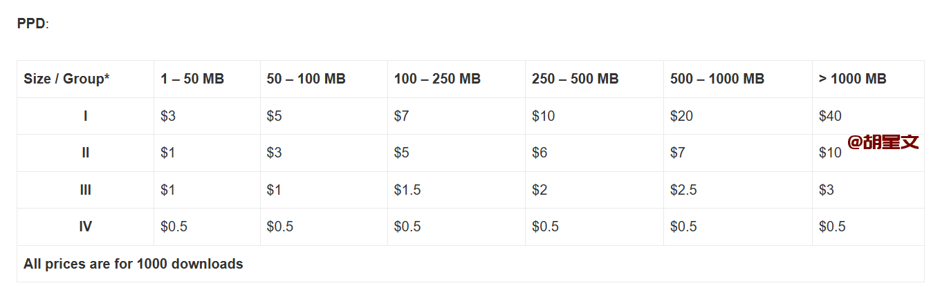 PPD按下载次数赚收益,按照国家地区来和文件大小来区分,千次下载最低收益是2-10美元,最高9-50美元。
