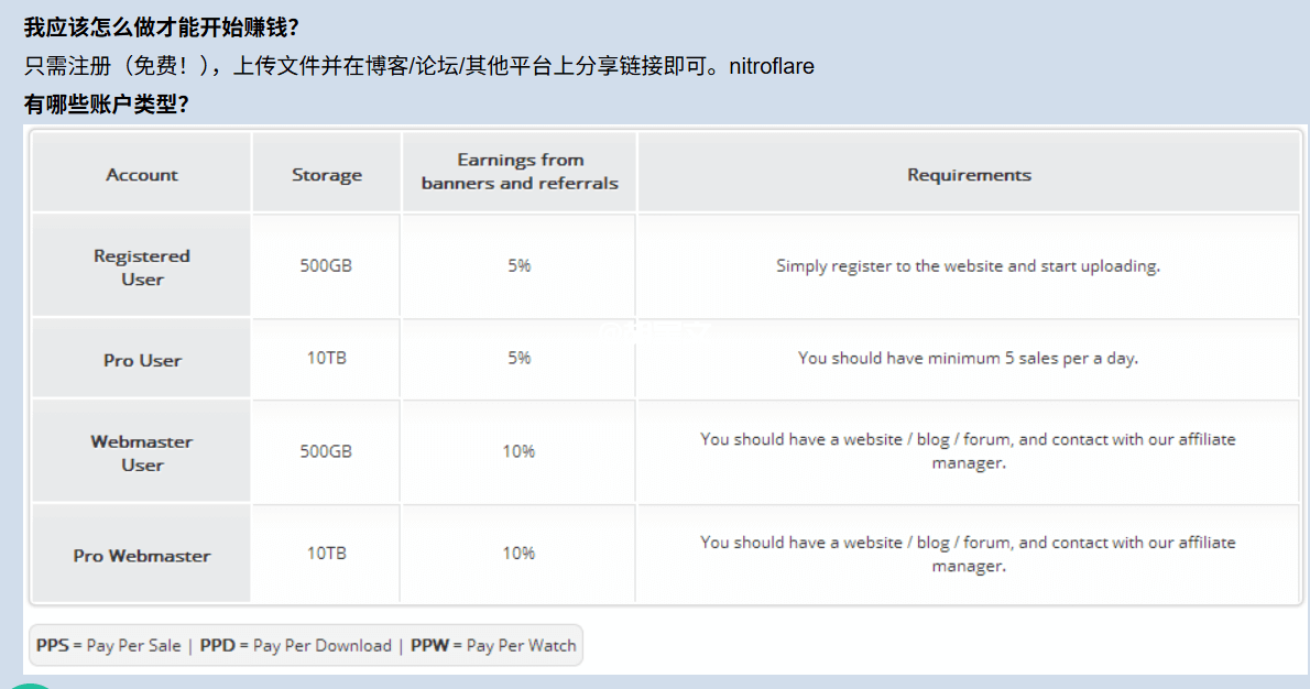 NitroFlare平台采用的是PPD+PPS的混合收益模式,也就是说,NitroFlare不区分国家地区,不区分文件大小,但是文件大小至少要在5MB以上,每千次有效下载收益是3美元。