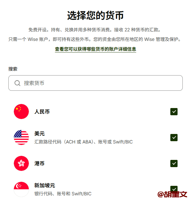 这里大家可以看到,只需要一个wise账户就可以,拥有全世界22种主流货币的账户。