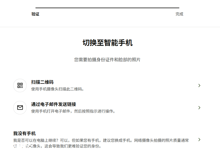 我们选择第一种方式,使用手机“扫描二维码”,然后使用手机拍摄身份证照片和人脸识别,就可以通过验证了。